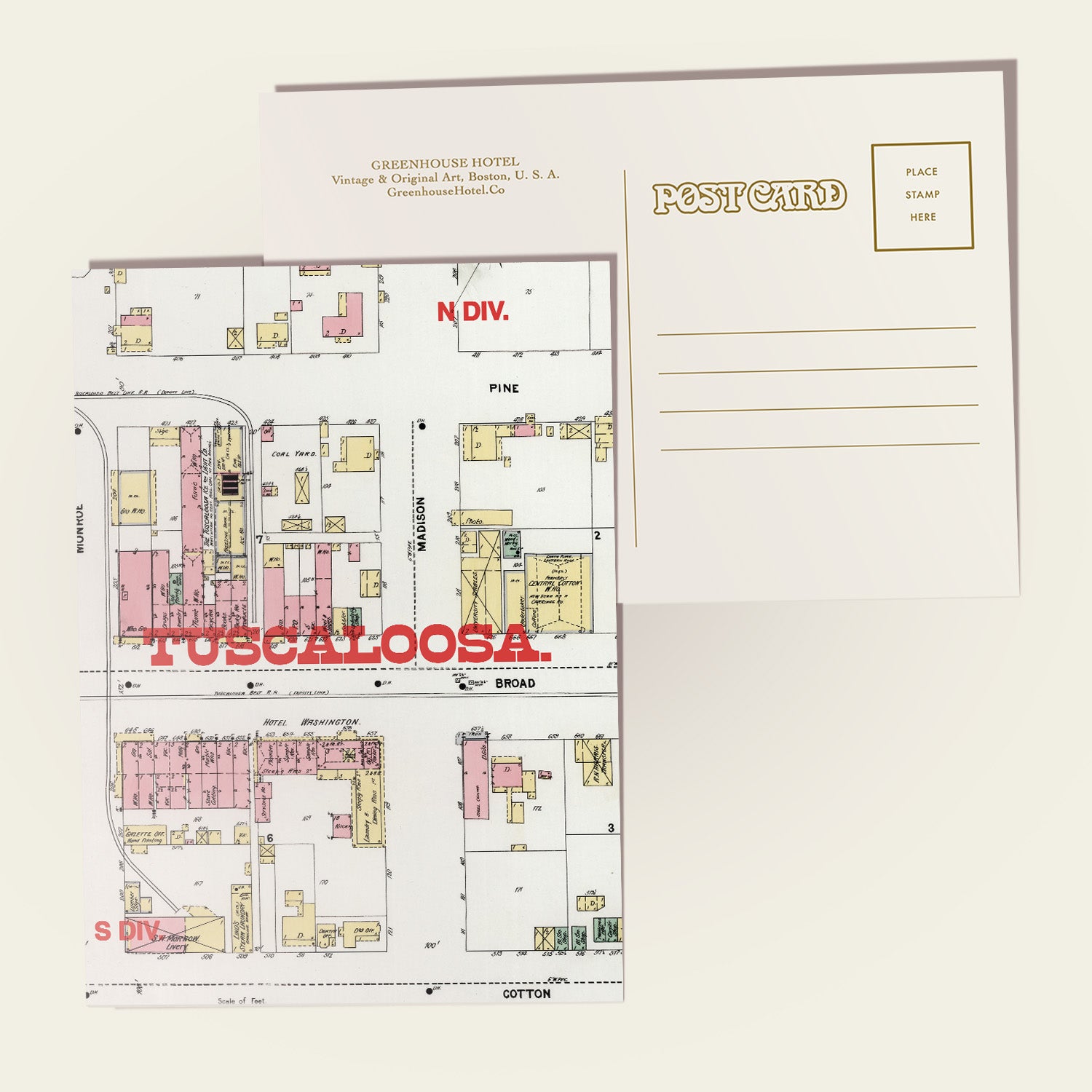 Inspired by an insurance map from the early 1900s. Each postcard is professionally produced using archival inks on thick cardstock. The back is lined and ready for your message—though many savvy shoppers pop them into a frame or stick them on the fridge like tiny modern heirlooms.
