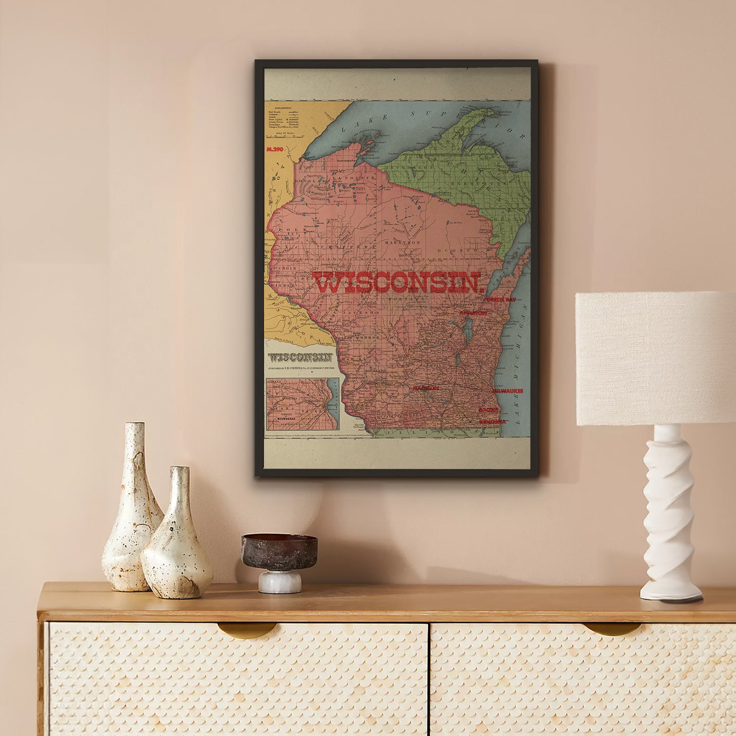 Inspired from a vintage geological map of Wisconsin from the 1850s, this print preserves the details of county lines, waterways, and geographic contours. Each print is rendered on museum-quality fine art paper using archival inks to highlight the map’s rich texture and timeless design.